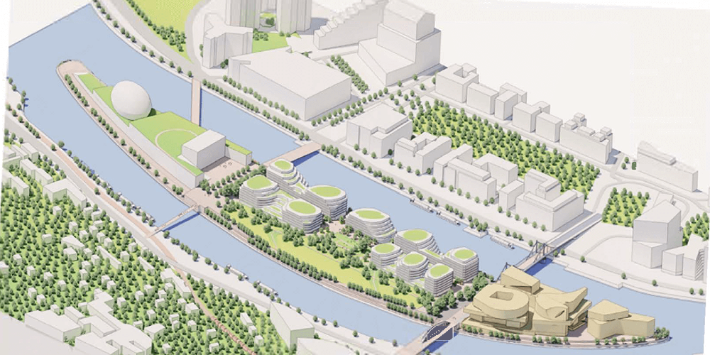 Le projet se distingue par son audace architecturale, avec notamment le centre d’art en porte-à-faux sur la Seine, symbolisant un pont culturel entre les deux rives. La terrasse haute du centre culturel, conçue comme un havre de verdure, accueillera un jardin luxuriant. Les bureaux, disposés sur cette terrasse, s'intégreront harmonieusement dans le paysage des coteaux environnants, offrant une fusion entre nature et architecture. L'île devient une destination piétonne privilégiée pour tous les amoureux de la nature et de la culture.