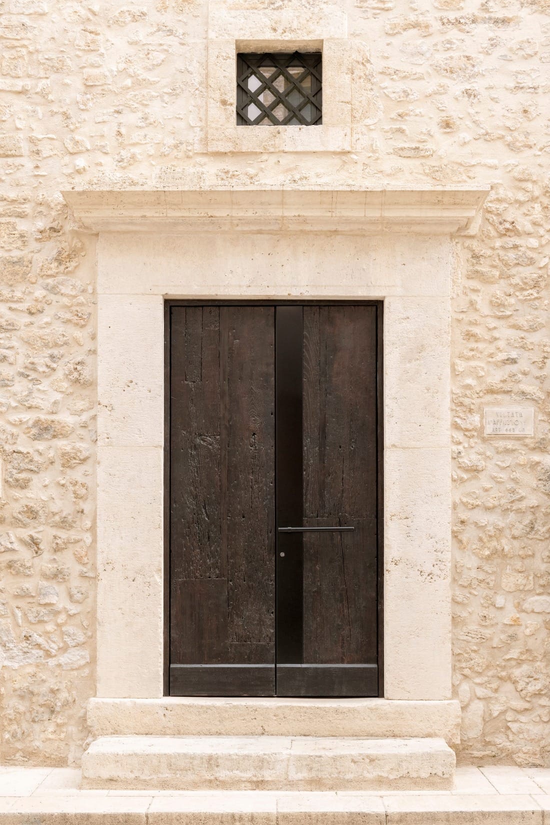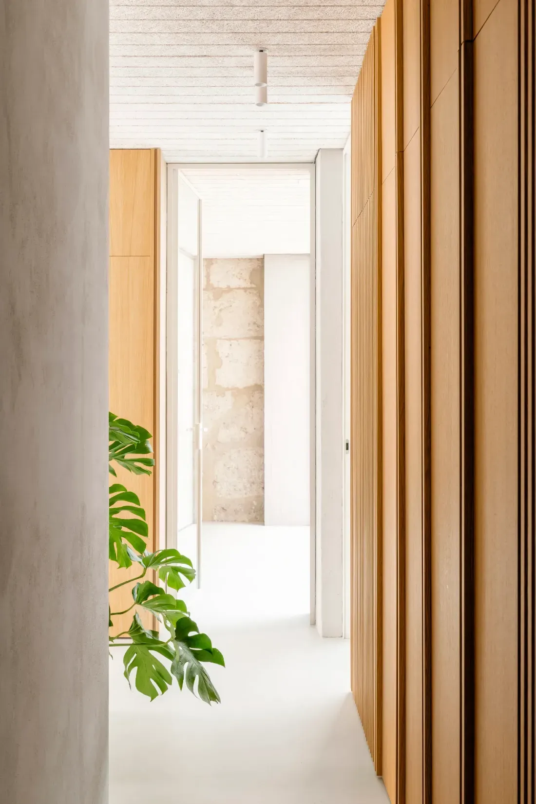 Dès l’extérieur, la noblesse discrète des murs anciens restaurés laisse deviner un geste intérieur subtil. Aucun effet tapageur. À l’intérieur, le blanc, la pierre et le bois dessinent un vocabulaire clair, simple, qui efface les cloisons sans perdre en lisibilité. La structure d’origine massive est contournée par un jeu d’éléments légers en verre et chêne naturel. Les circulations se faufilent librement autour d’un puits de lumière central, où les rayons descendent jusqu’au cœur du bâtiment, révélant textures et ombres dans une atmosphère presque monastique.