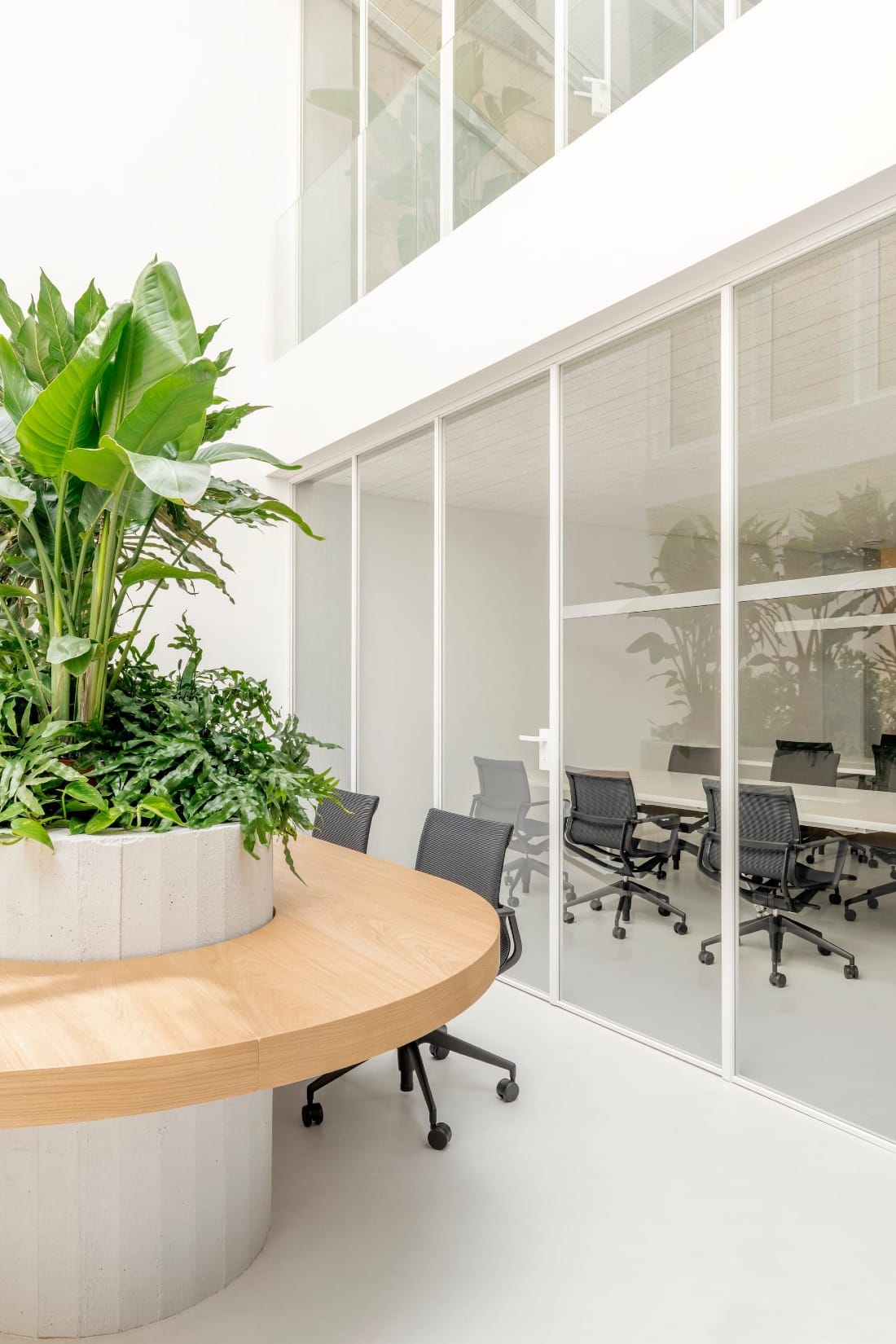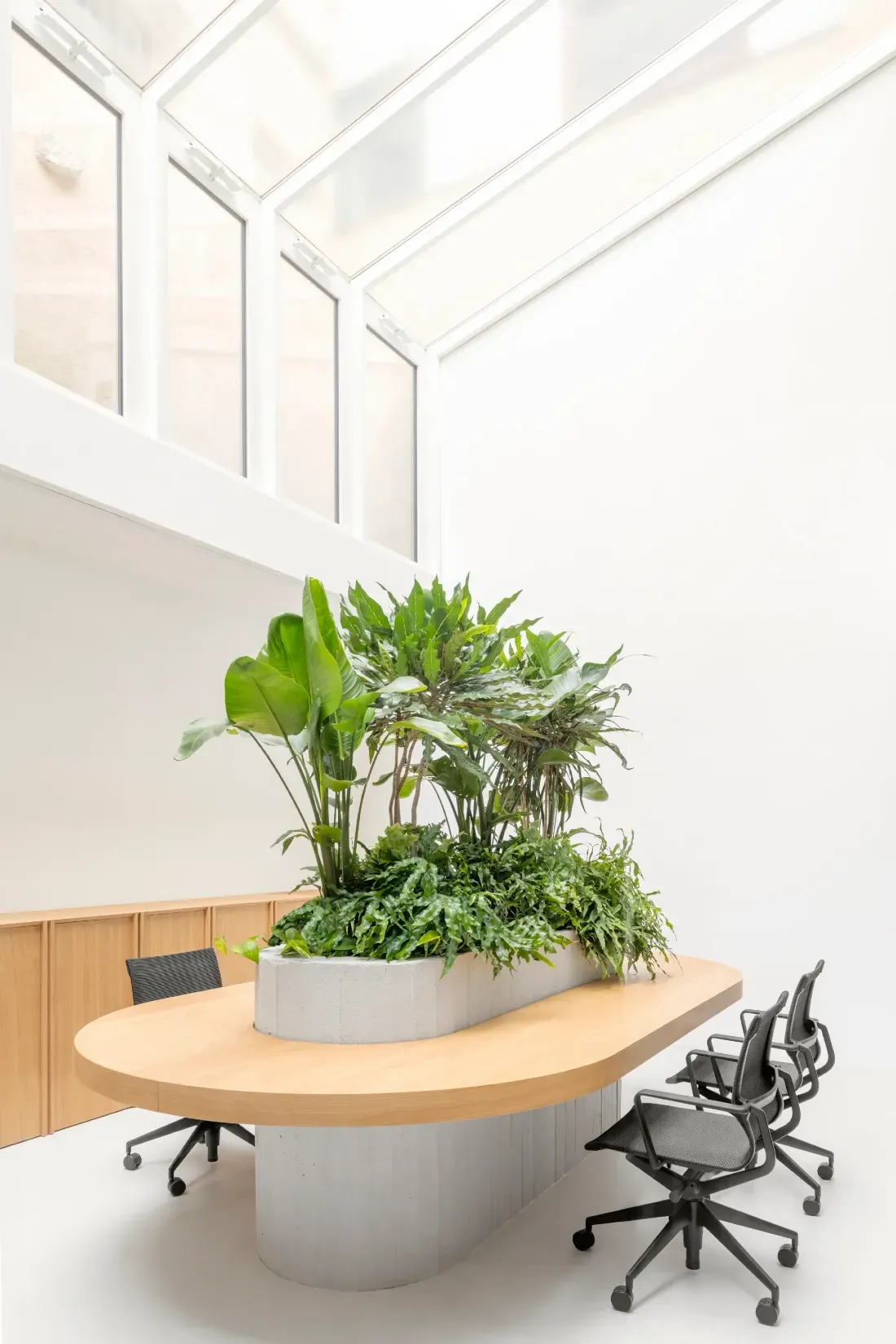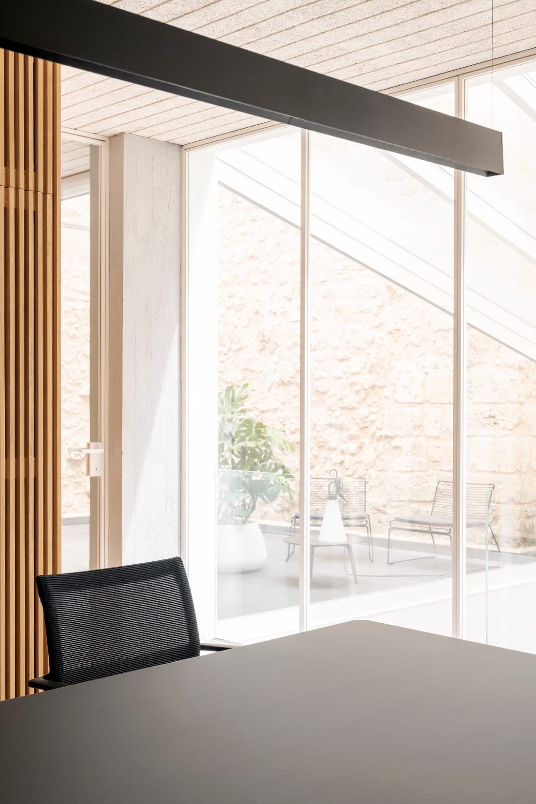 La durabilité, enfin, se glisse dans les détails : conservation de la structure, réduction des démolitions, ventilation naturelle et choix de matériaux performants, comme le toit en fibre de bois. Prior Ecclesia est plus qu’un bureau : c’est une réponse à la lumière, à l’usage et à l’histoire, dans une harmonie qui ne cherche pas à s’imposer mais à durer.