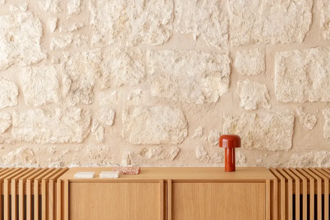 La matière raconte aussi une histoire : les murs de pierre ont été laissés apparents, tandis que le mobilier intégré dessiné sur mesure dialogue avec eux. Cloisons-meubles, niches, rangements ou assises sont habillés d’un bois chaleureux qui souligne les lignes de force. L’ensemble évoque une élégance méditerranéenne, à la fois douce et radicale.