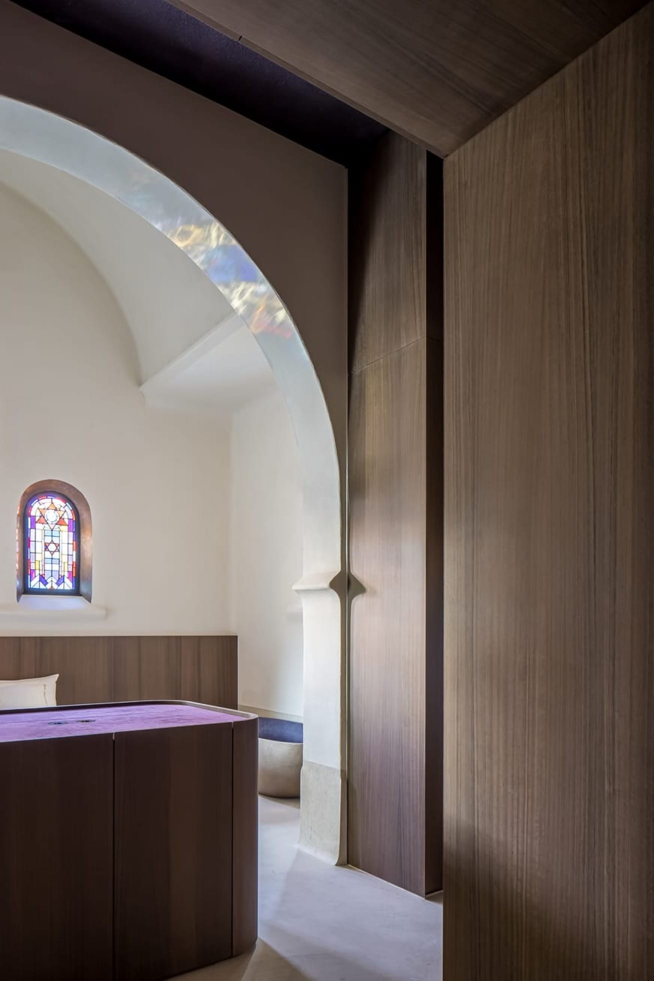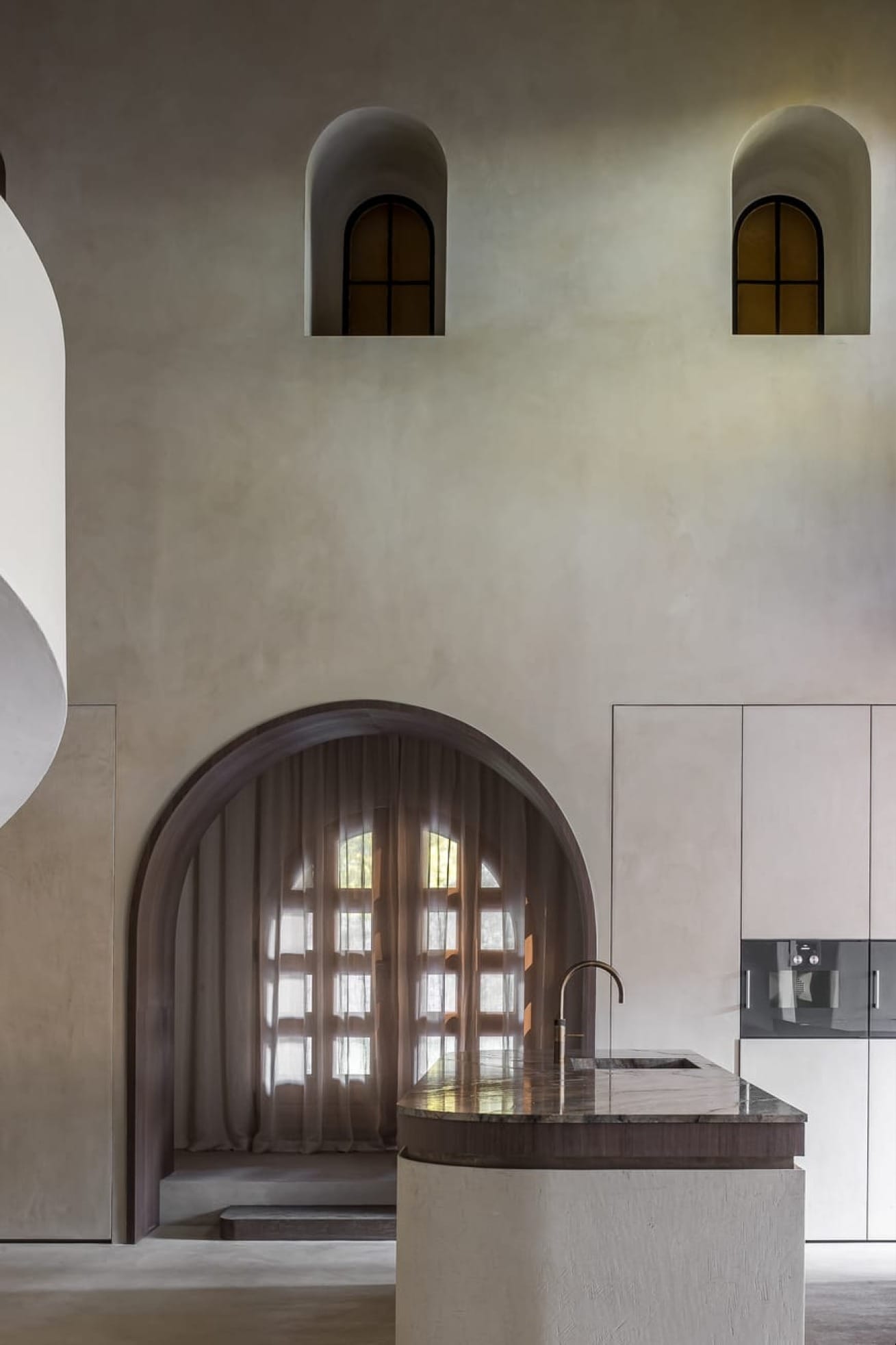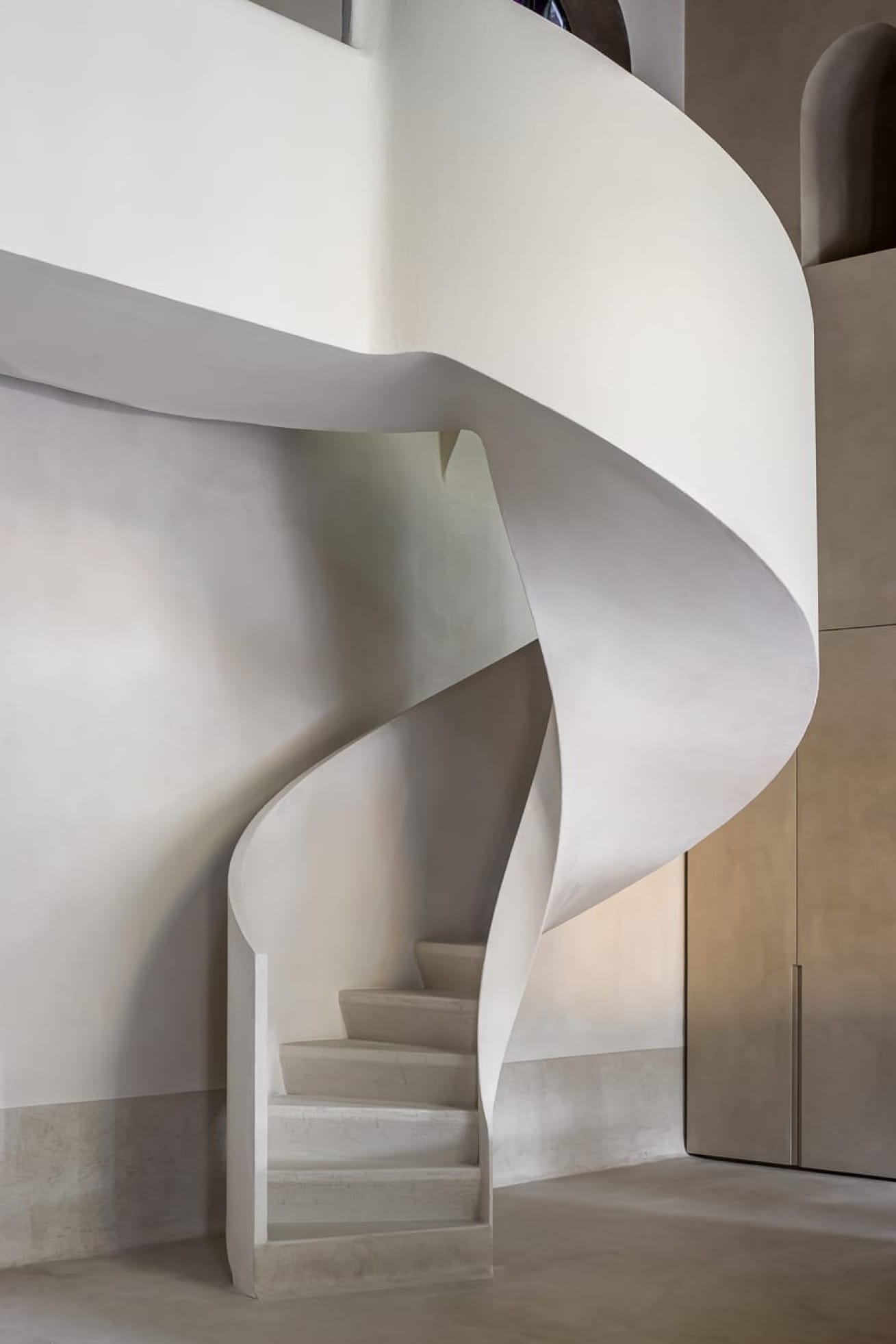Le projet conjugue matériaux contemporains et éléments d’origine : vitraux, arches en pierre et menuiseries ont été restaurés avec soin. La teinte douce épouse la lumière naturelle, tout en soulignant la géométrie monumentale de l’espace. Sa finesse (3 mm d’épaisseur) permet de recouvrir les surfaces existantes sans rupture visuelle. L’escalier hélicoïdal, les seuils et les plinthes prennent une dimension sculpturale grâce à ce matériau texturé et mat.
