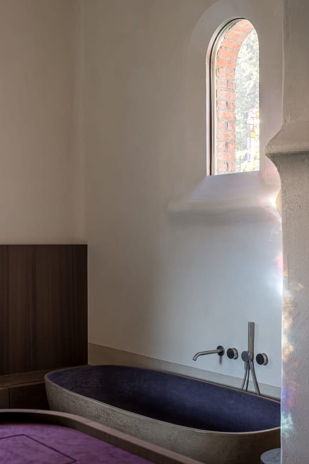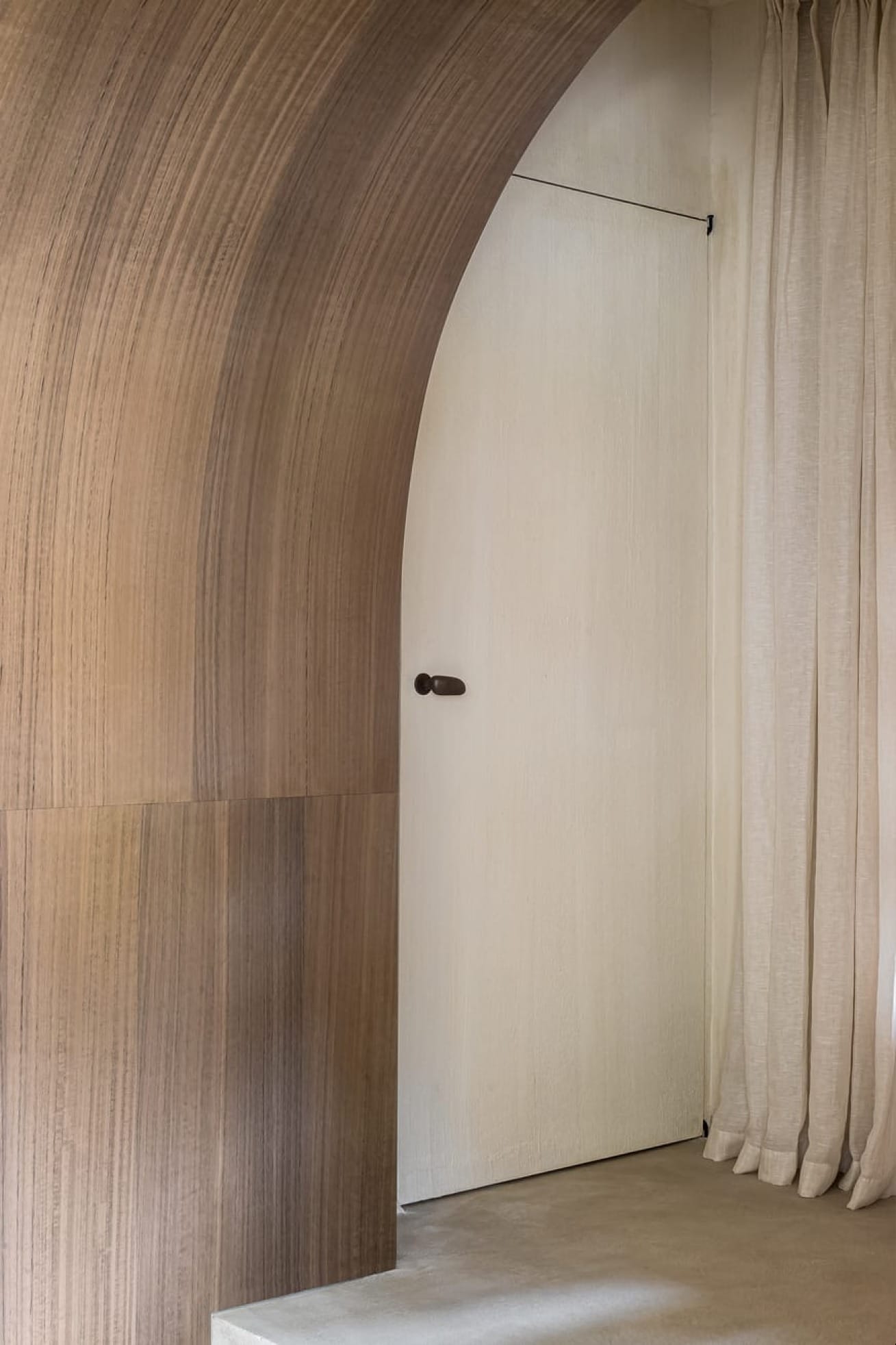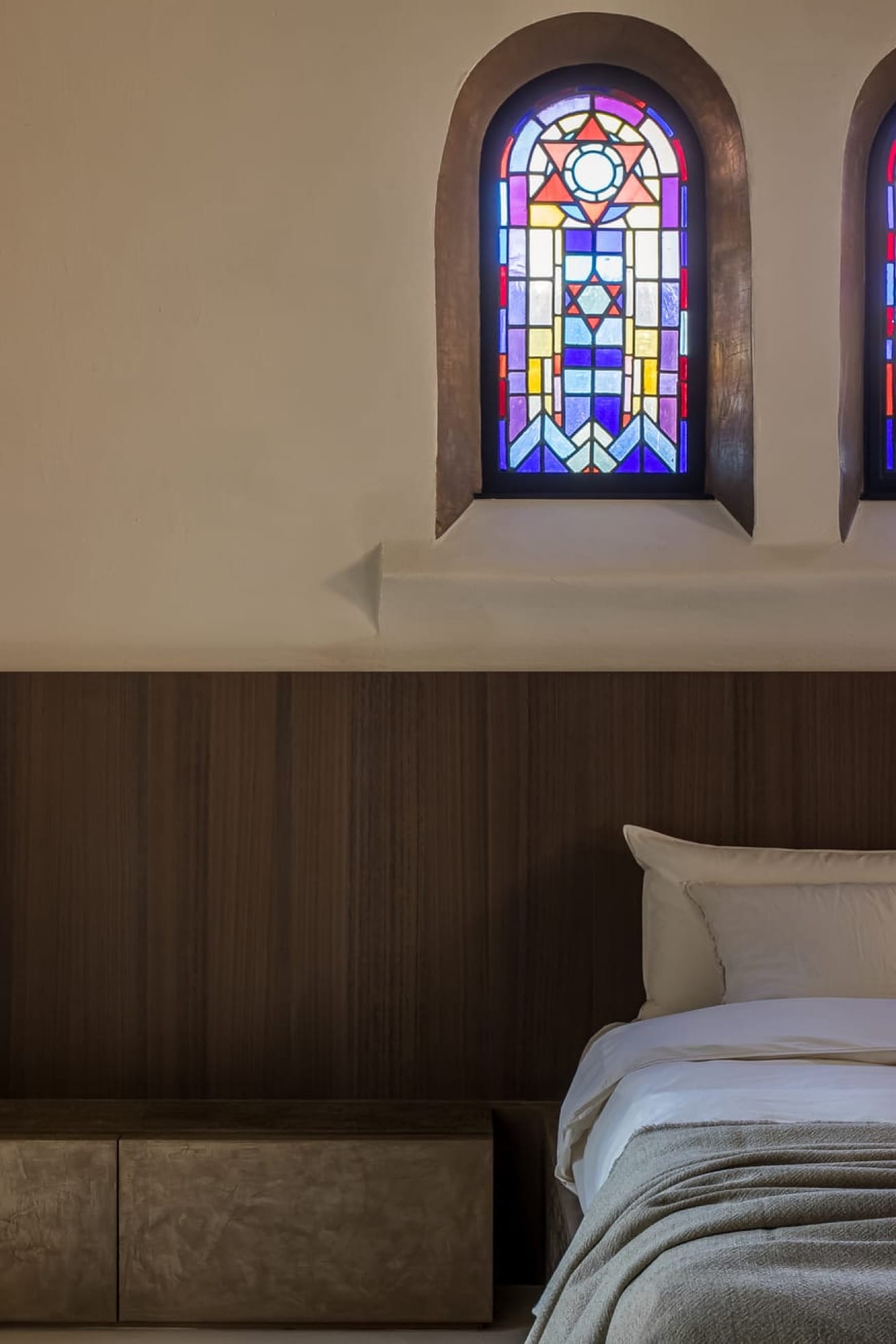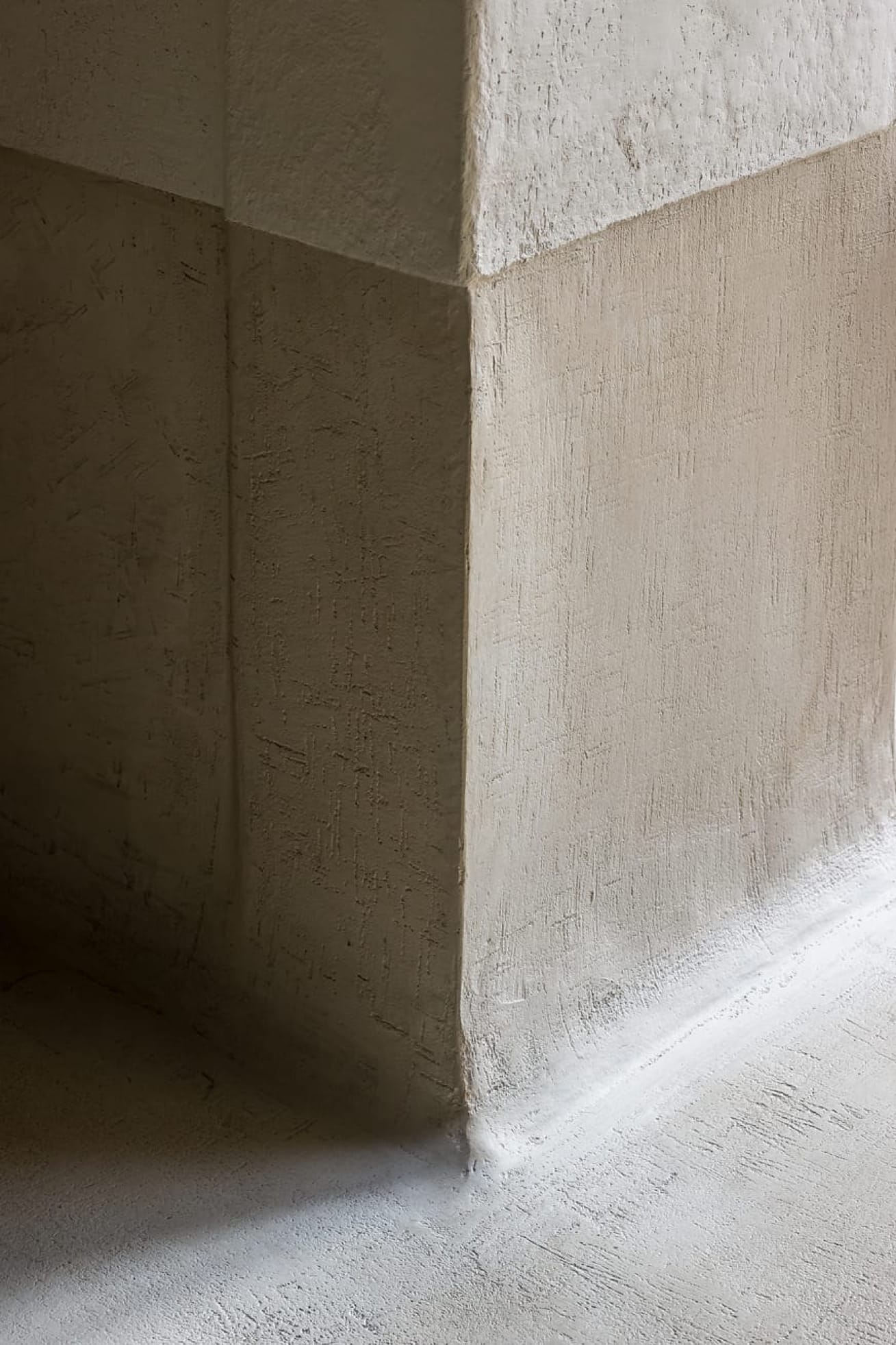 Le projet conjugue matériaux contemporains et éléments d’origine : vitraux, arches en pierre et menuiseries ont été restaurés avec soin. La teinte douce épouse la lumière naturelle, tout en soulignant la géométrie monumentale de l’espace. Sa finesse (3 mm d’épaisseur) permet de recouvrir les surfaces existantes sans rupture visuelle. L’escalier hélicoïdal, les seuils et les plinthes prennent une dimension sculpturale grâce à ce matériau texturé et mat.