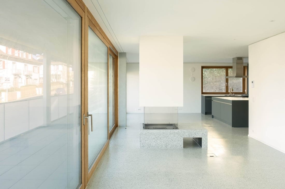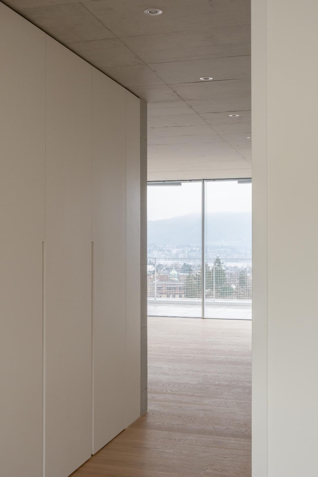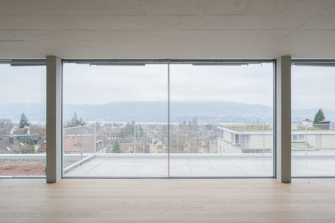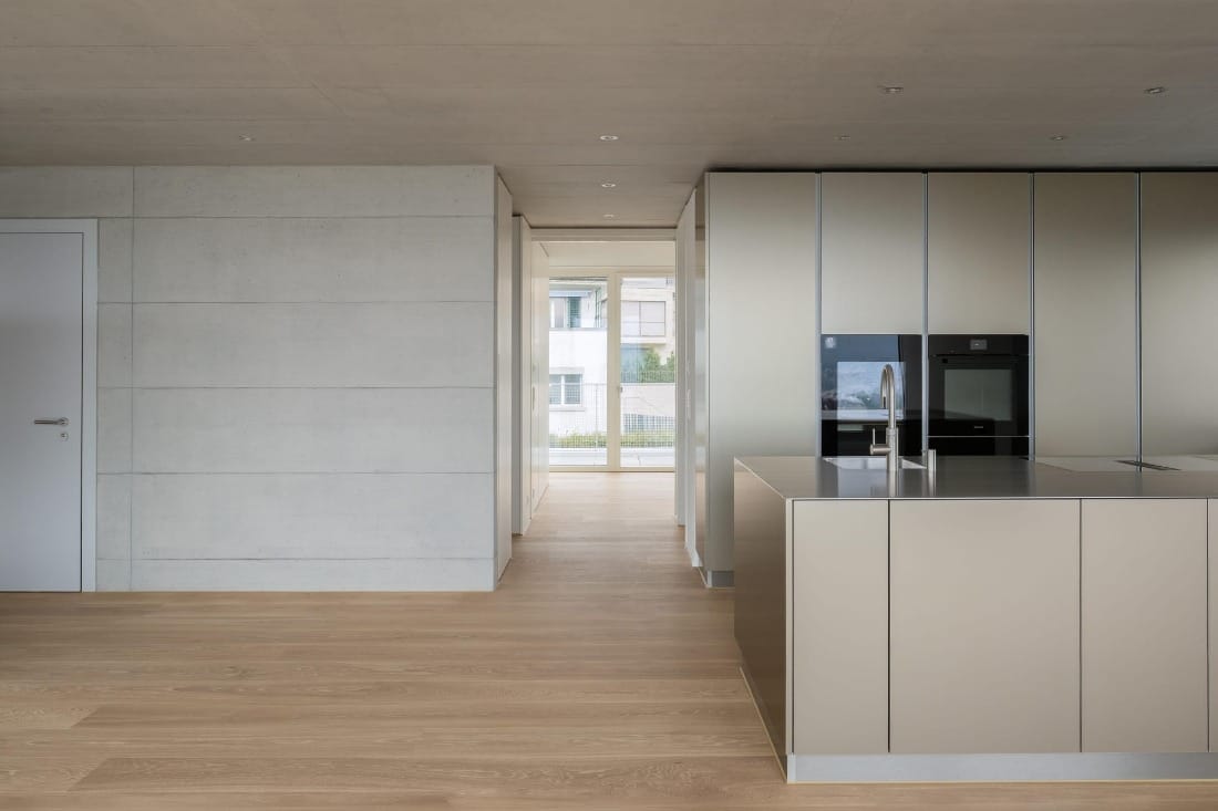 L’organisation intérieure repose sur un noyau compact qui libère des façades largement vitrées, orientées est-ouest. Les séjours bénéficient ainsi d’un lien direct avec l’extérieur, tandis que les pièces de nuit s’adossent à la circulation centrale. Le détail des matériaux prolonge cette précision : terrazzo au sol, murs enduits de plâtre, menuiseries soignées et chape d’anhydrite forment un cadre sobre mais qualitatif. Les garde-corps en aluminium anodisé apportent une ponctuation discrète, renforçant la lisibilité de la structure sans excès de langage.