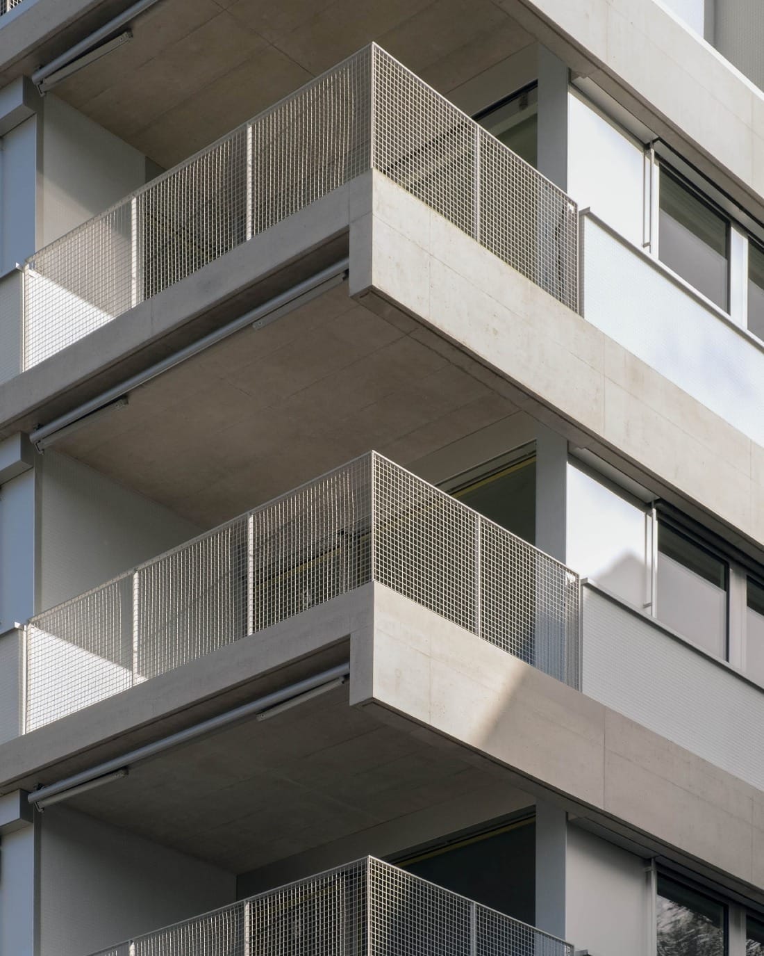 Situé dans un quartier résidentiel de Zurich, le projet SBS16 de DÜRIG AG développe une architecture rigoureuse articulée autour d’un empilement de typologies variées. Chaque étage se distingue par sa propre volumétrie, tout en étant unifié par de larges bandeaux horizontaux en béton apparent. Ces éléments structurels, lisibles en façade, dessinent un langage rationnel, répétitif mais subtilement animé par les variations d’orientation, d’usage et de profondeur des loggias.