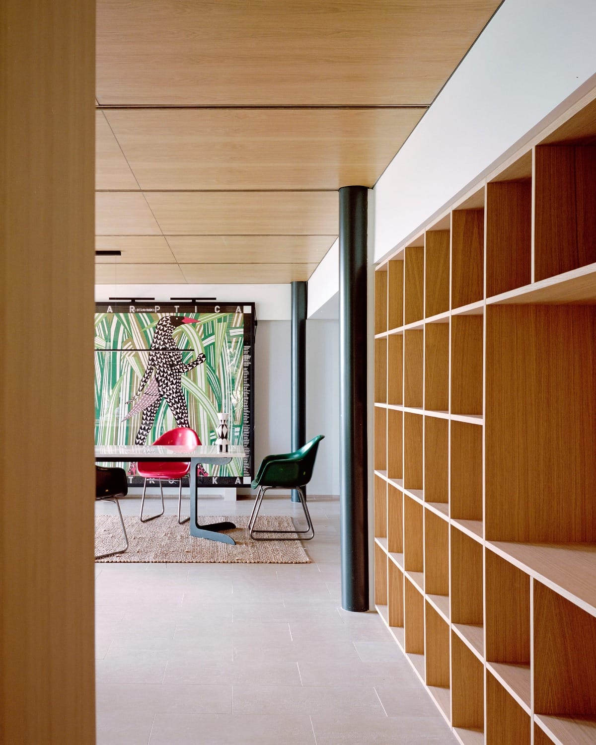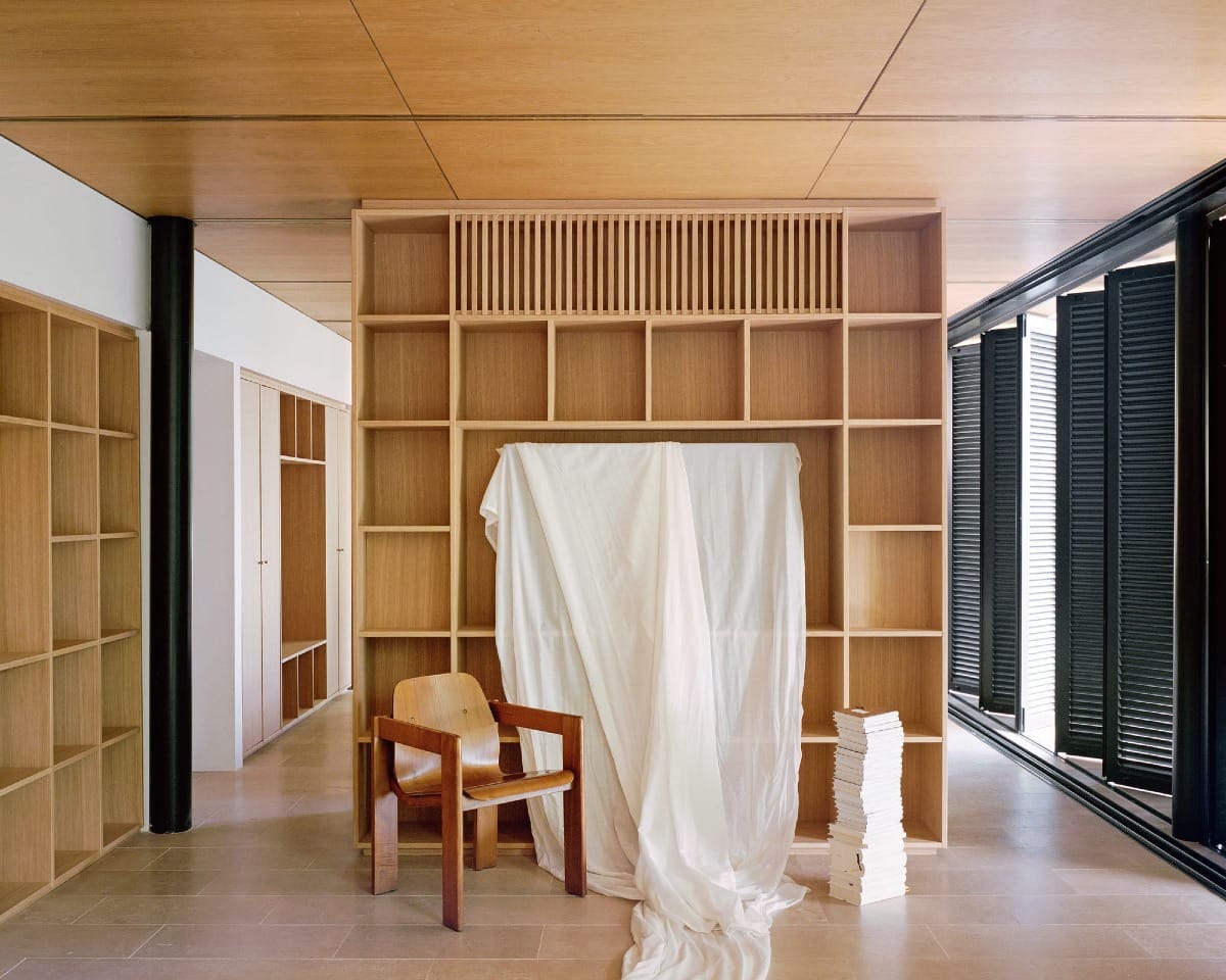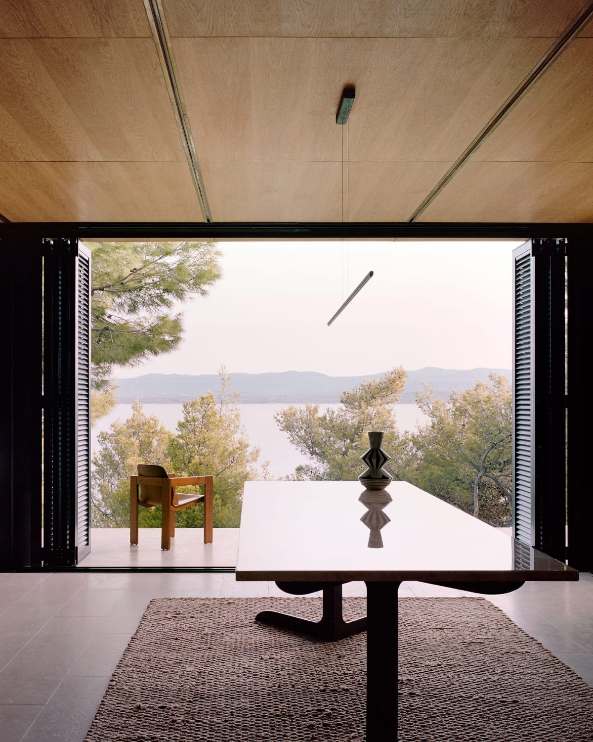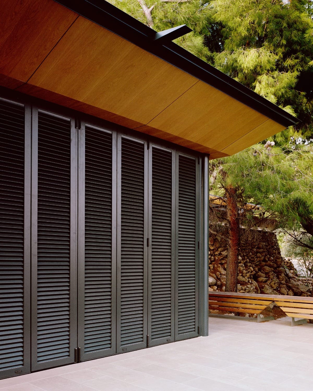 L’architecture se compose d’un volume bas et linéaire, largement ouvert sur l’horizon. La structure, tendue entre les pins, alterne murs en bois blond et volets métalliques pliants, permettant de moduler l’intimité et la lumière. Les matériaux – bois, métal, verre – sont traités dans une palette sobre, favorisant une ambiance apaisée. Le plan intérieur, fluide et continu, se dilate au rythme des ouvertures et de la lumière naturelle.