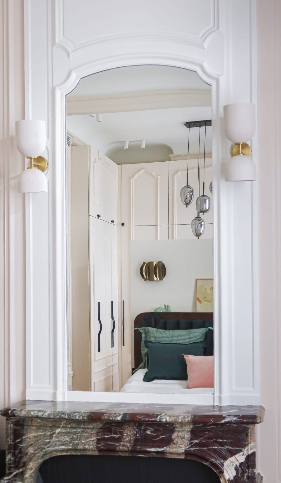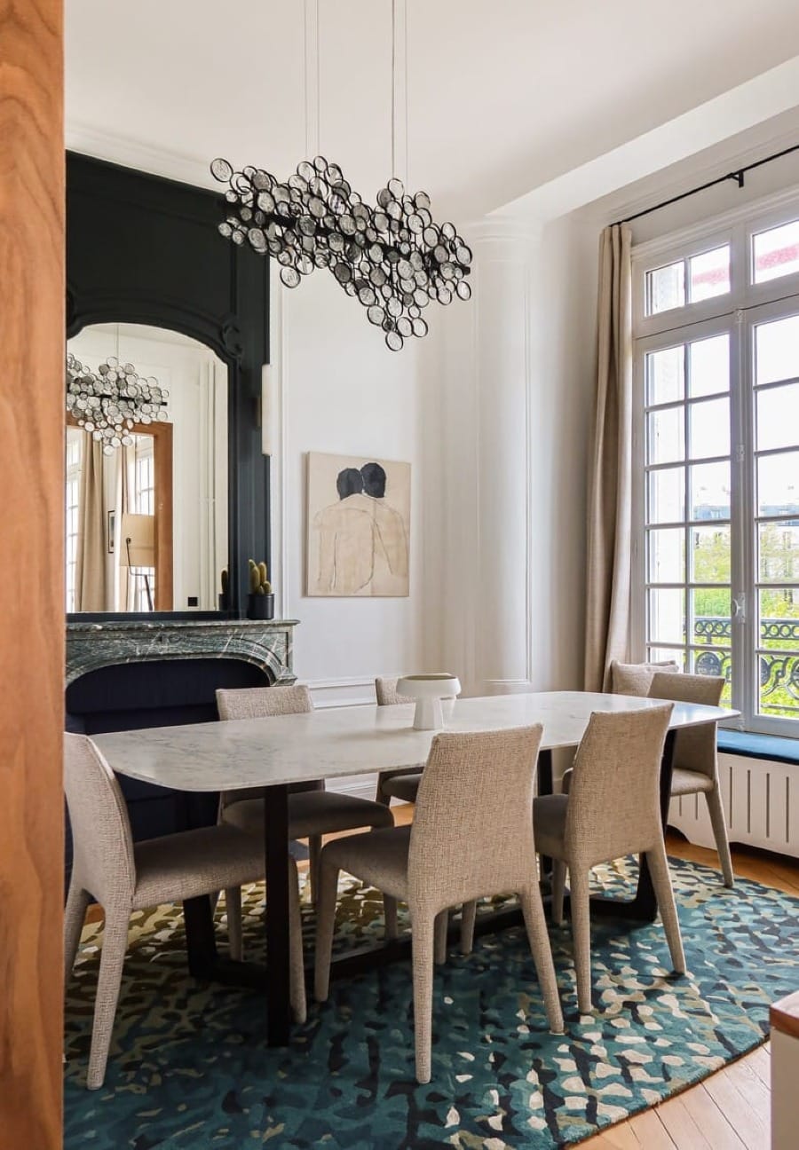 Le plan a été réorganisé avec précision afin de fluidifier les circulations tout en valorisant les éléments patrimoniaux : moulures, cheminées et hauteurs sous plafond sont conservés et mis en dialogue avec une palette de matériaux et de couleurs cohérente. Le séjour joue sur des textures chaleureuses, associant bois laqué, tissus texturés et teintes sourdes. Le coin salle à manger s’organise autour d’une table en pierre claire, éclairée par une suspension sculpturale, avec une cheminée d’origine restaurée.