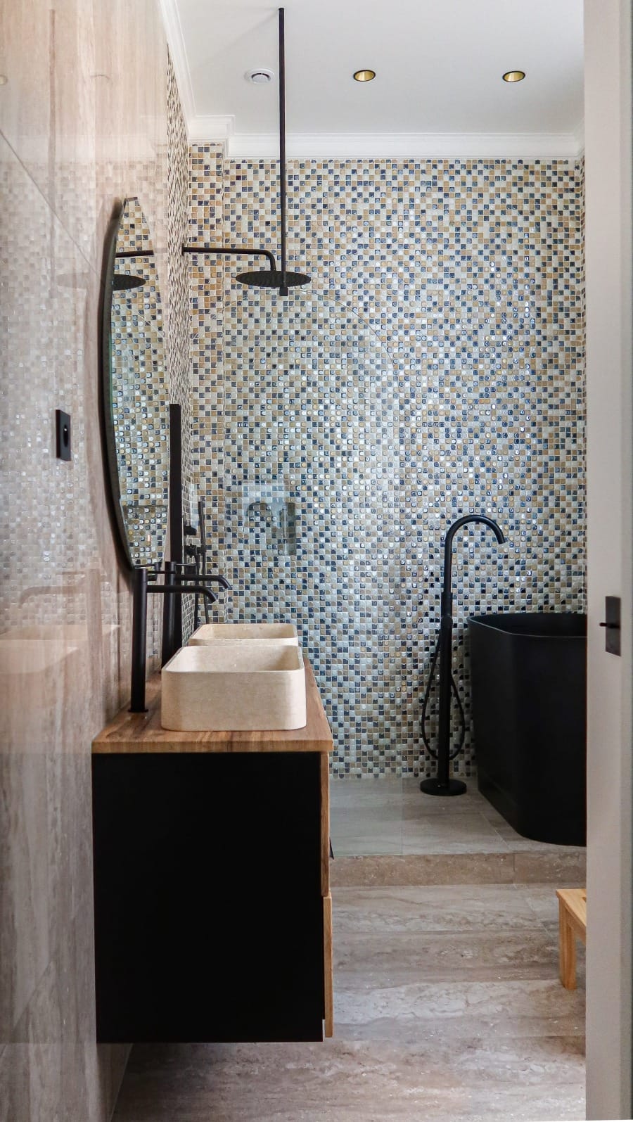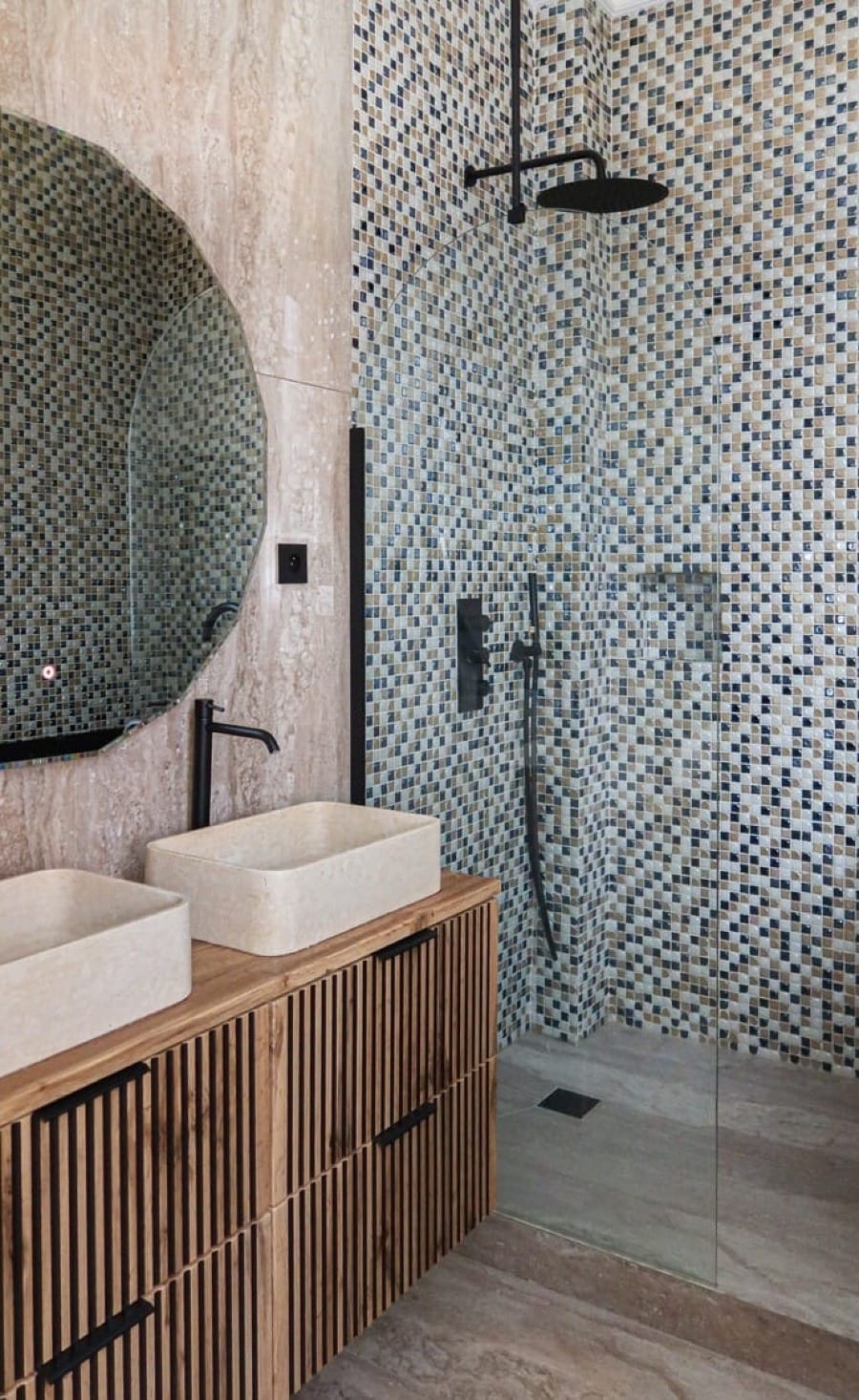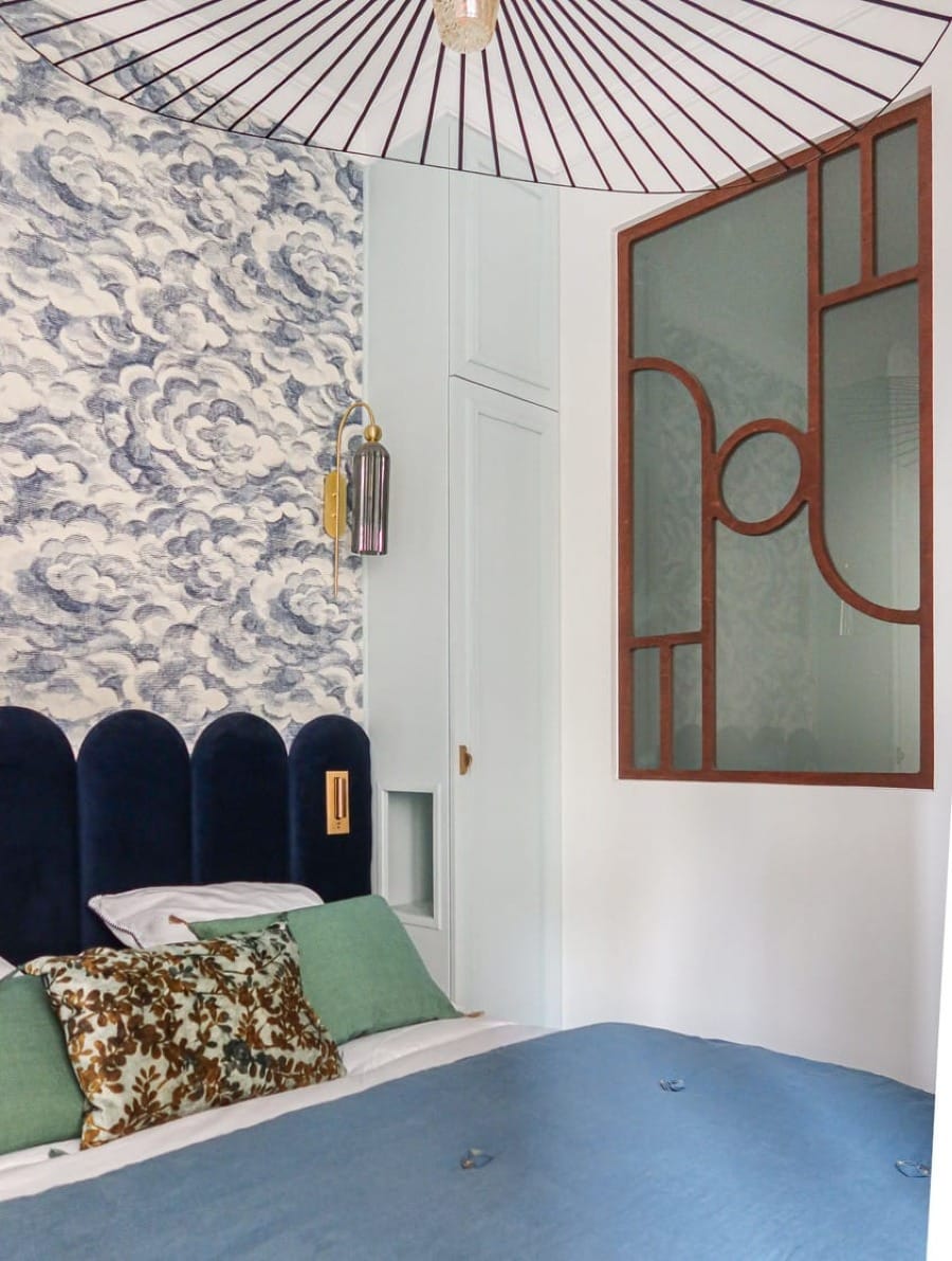 Dans la salle de bain, le choix d’un mobilier en bois rainuré, de vasques en pierre et de faïences mosaïques accentue l’alliance entre confort et durabilité. La chambre met en valeur une tête de lit tapissée et une composition graphique murale, renforçant l’identité visuelle du projet. Chaque détail technique ou décoratif participe à un ensemble cohérent, pensé pour une occupation immédiate.