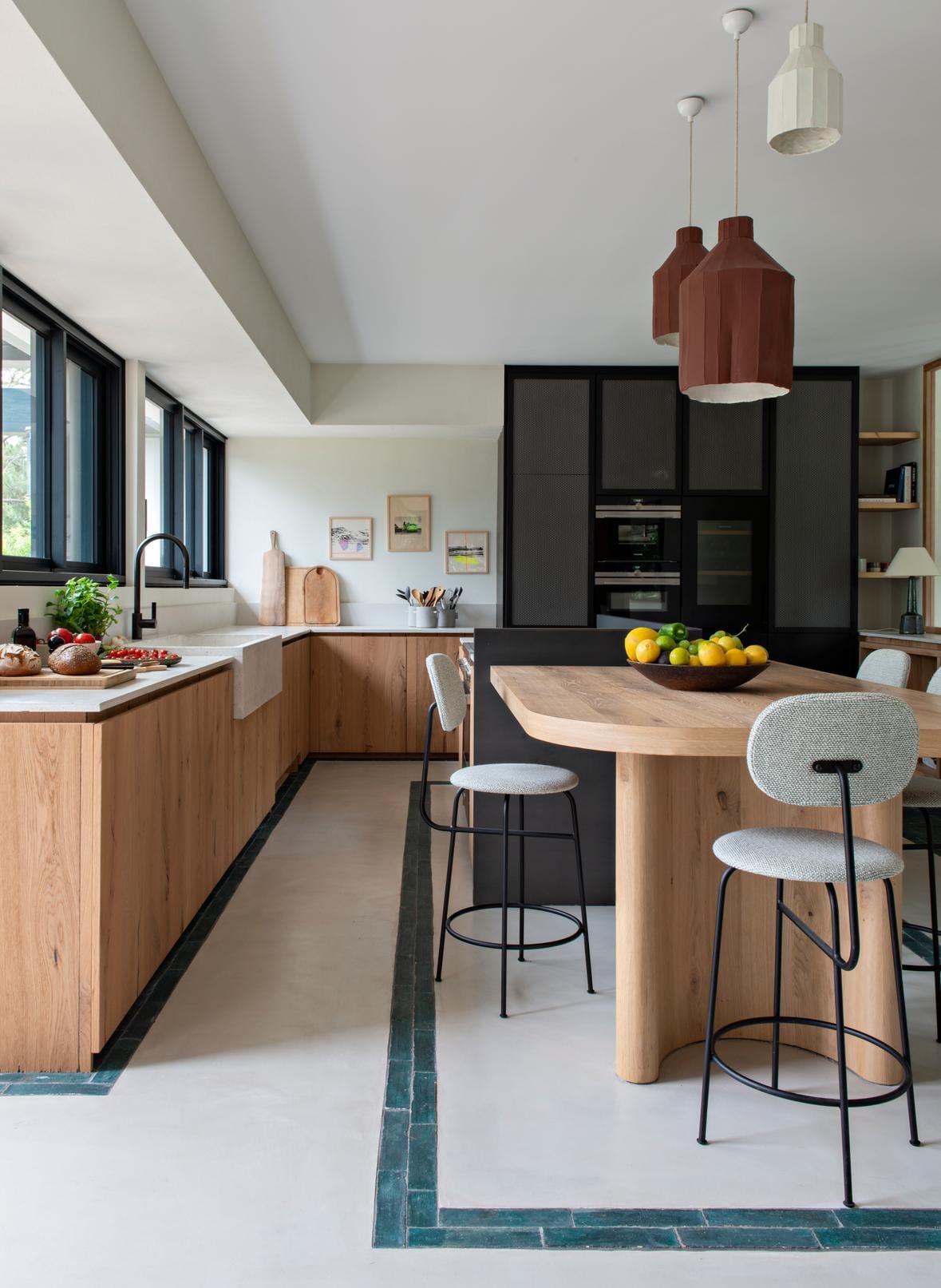 À l’intérieur, les espaces sont généreusement ouverts sur l’extérieur grâce à de grandes baies verticales qui cadrent le paysage et diffusent la lumière naturelle. L’aménagement décline une palette sobre de matériaux bruts — béton, bois, enduits — renforçant la continuité entre intérieur et environnement. Le travail des niveaux et des percées visuelles favorise une fluidité sans rupture, avec une attention portée au confort et à la spatialité. Ce projet exprime une lecture contemporaine du style basque, ancrée dans son territoire, sans pastiche ni ostentation, et portée par une cohérence architecturale et paysagère.