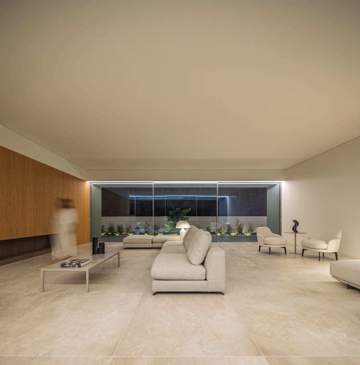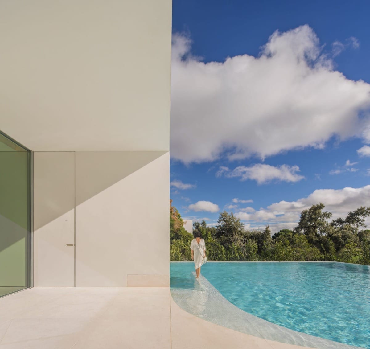 Implantée dans l’environnement paysager de La Moraleja, la Villa 18 conçue par Fran Silvestre Arquitectos adopte une logique d’étirement horizontal et de lecture topographique. La géométrie du projet répond aux diagonales du site, structurant une séquence architecturale ouverte sur le lac de golf. Trois volumes distincts définissent le plan : les espaces de jour se développent en strates décalées créant des zones intermédiaires, tandis que l’aile nocturne, plus basse et protégée, se fond dans le jardin.