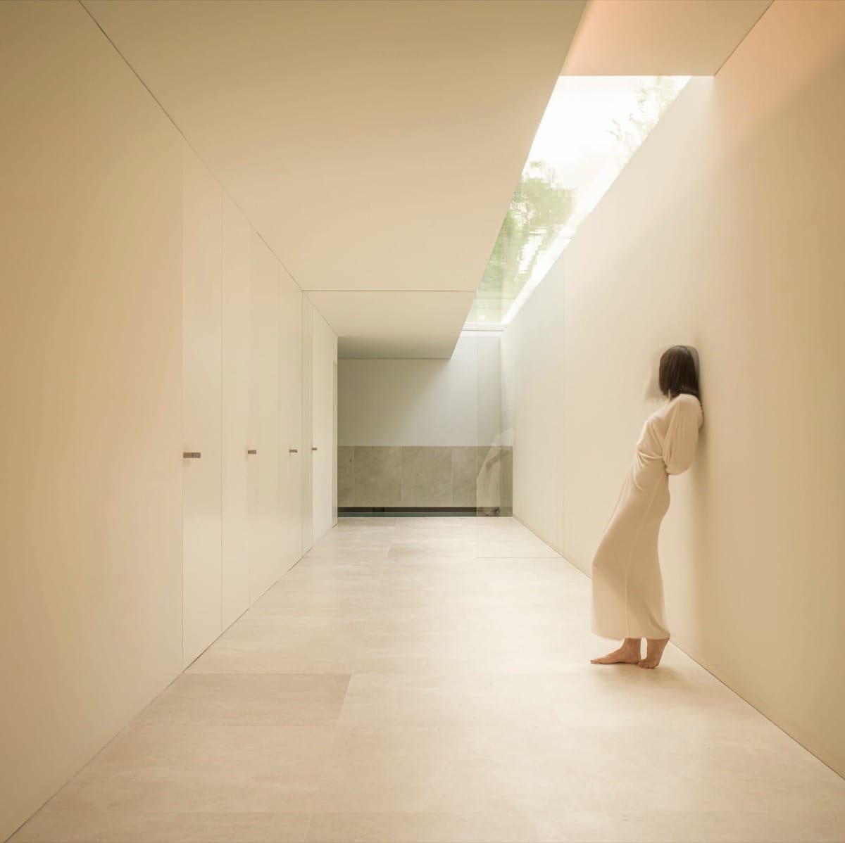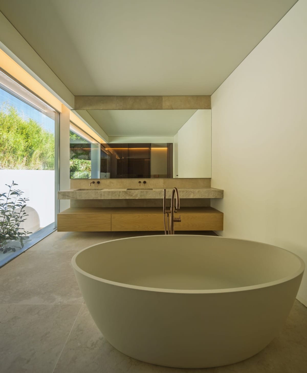 Le sous-sol accueille des fonctions de bien-être, ouvertes sur des patios et éclairées par des verrières discrètement intégrées. Les choix matériels – pierre de Colmenar, bois de frêne, laiton patiné – dessinent un intérieur lumineux et homogène, où les finitions renforcent l’élégance sobre du projet.