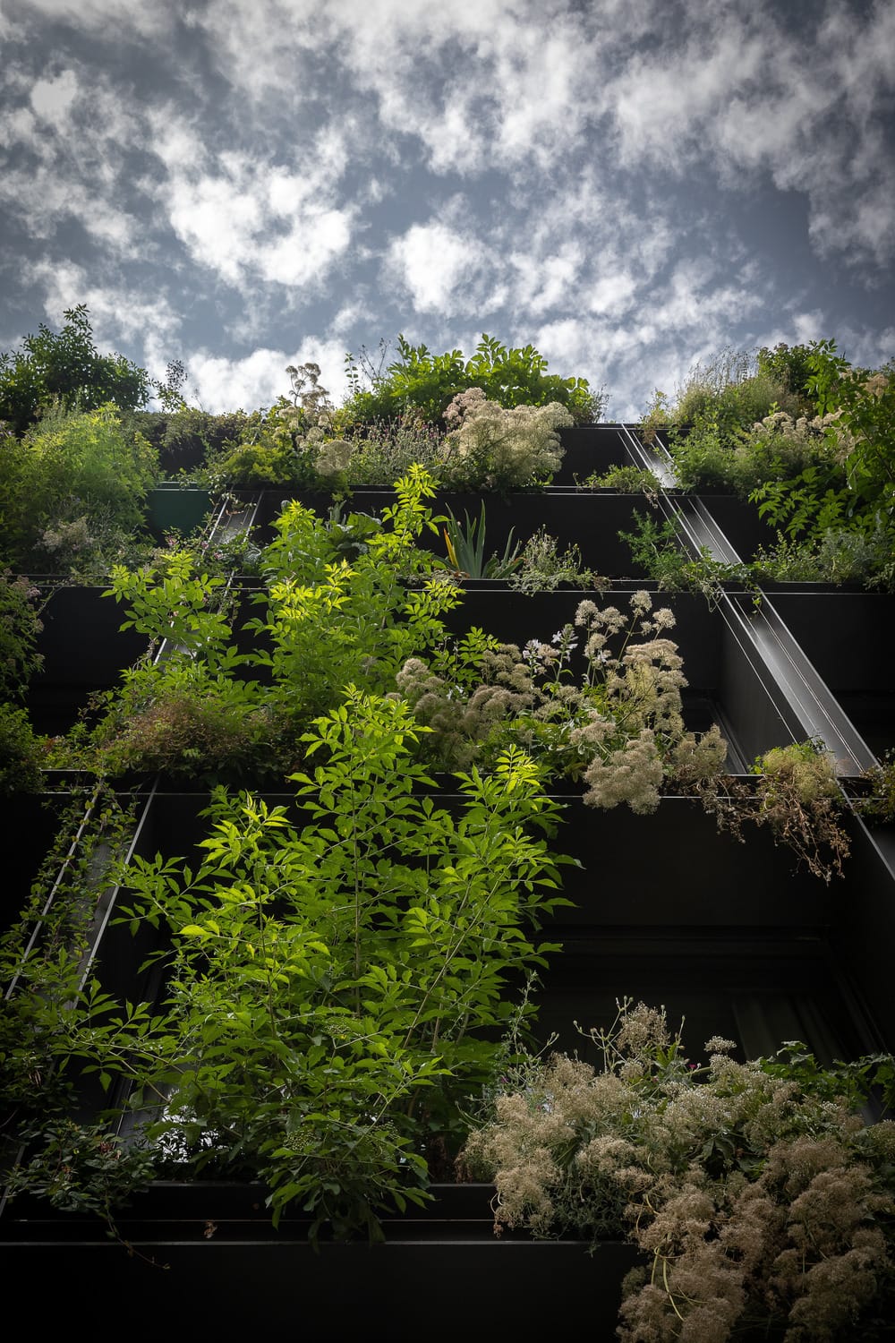 L’exosquelette métallique dessine la silhouette du lieu. Il porte une végétation structurée : arbres fruitiers, lianes, plantes médicinales. La façade devient climatique, perméable, réactive. Chaque élément est pensé pour durer, pour vivre, pour répondre à une logique environnementale simple et directe. Une esthétique de la fonction, sobre et modulaire.