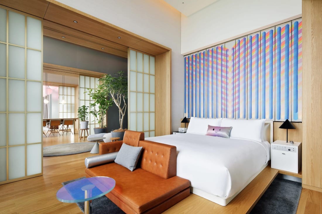 Aux étages, les chambres poursuivent cette approche par contrastes : épure japonaise et accents pop y cohabitent dans une mise en scène chromatique assumée. Les matériaux — noyer, verre dépoli, papier de riz — encadrent une vue panoramique sur Osaka, tandis que la suite EWOW au dernier niveau offre un manifeste spatial à l’image du lieu : séquences modulables, équipements festifs et ancrage local réinterprété.