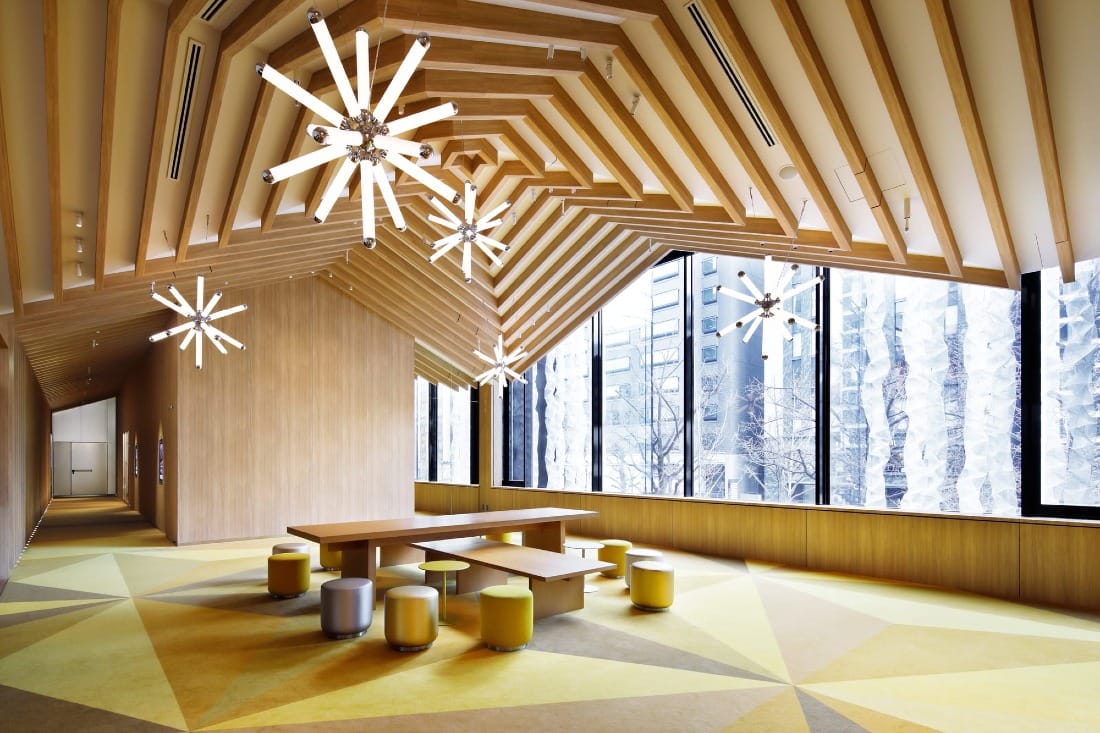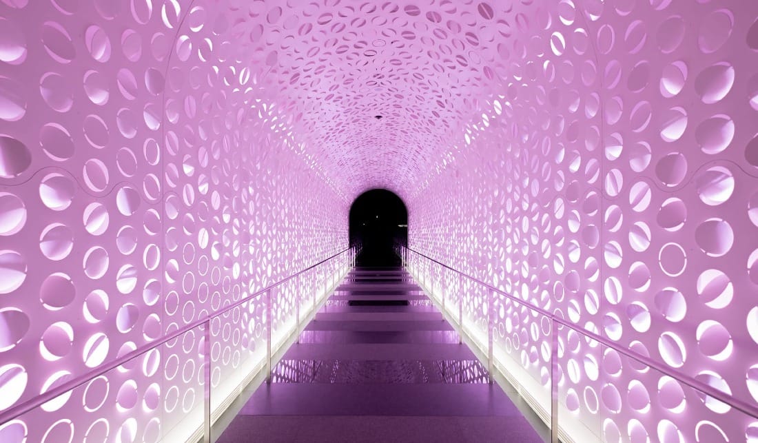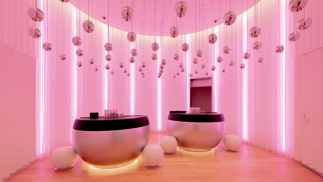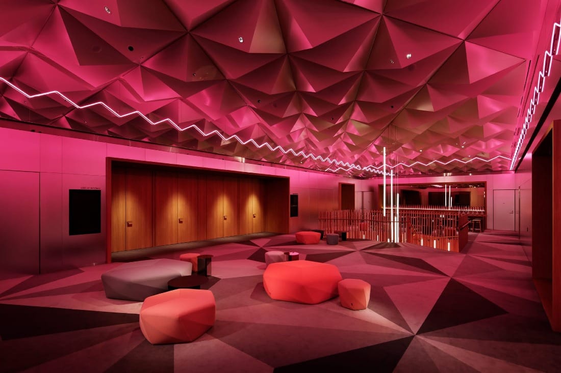 Le parcours spatial s’organise en séquences dynamiques. Dès le tunnel d’entrée perforé de motifs floraux inspirés de l’origami, le visiteur est immergé dans un jeu de lumière évolutif qui amorce un dialogue entre culture locale et extravagance sensorielle. Le lobby, structuré autour d’un plafond tridimensionnel aux motifs asanoha, déjoue les conventions par une spatialité dense, tandis que le bar remplace la réception traditionnelle pour devenir le point névralgique de l’hôtel. Un rideau translucide agit comme filtre mobile, modulant les usages et la perception des espaces.