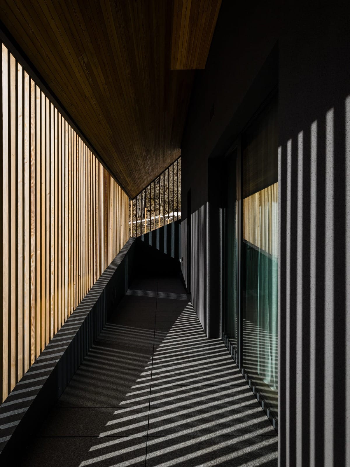 Ce dispositif en façade, alternant densité et porosité, permet de moduler les apports solaires tout en assurant l’intimité. Il génère un mouvement subtil, rendant la maison réactive à son environnement immédiat. En contrebas, les espaces de nuit et le spa s’ouvrent sur des terrasses discrètes, prolongeant la relation directe avec la montagne. À rebours des images attendues du luxe alpin, la Z House propose une réponse architecturale rigoureuse et contextuelle, attentive à la matière, à la lumière et à l’échelle du lieu.