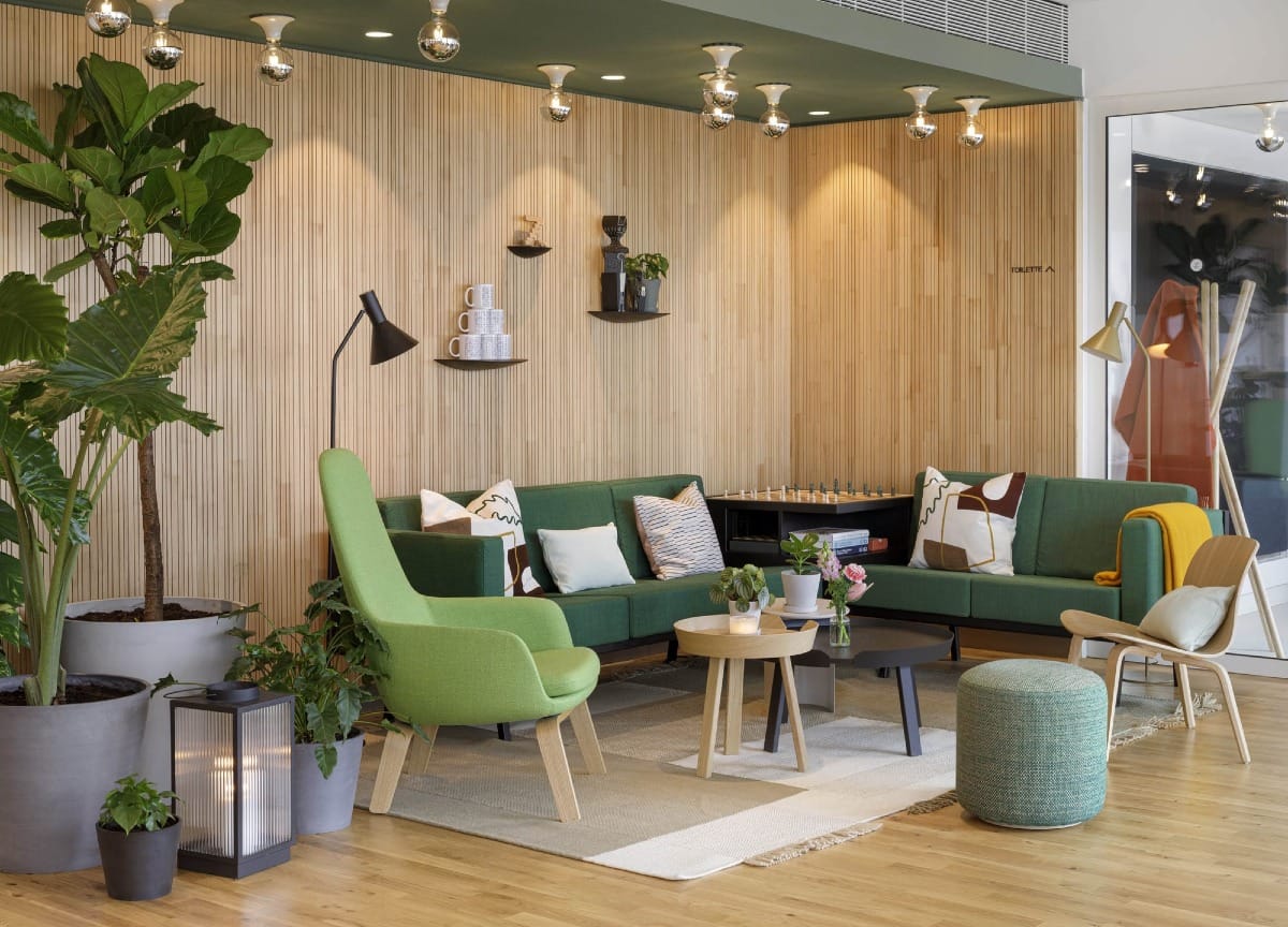 Le dernier étage concentre les espaces partagés dans une logique de maison commune : cuisine ouverte, bar Kindred Spirits, restaurant Living Kitchen, salles de réunion, coin musique, coworking, salle de jeux et potager en toiture. L’ensemble se développe dans une atmosphère chaleureuse et modulable, portée par un design sur mesure, des matériaux naturels et une palette chromatique douce. La terrasse extérieure, dotée d’une cheminée, de balançoires et de fauteuils suspendus, devient un îlot de calme au-dessus du tumulte parisien, favorisant l’appropriation spontanée des lieux.