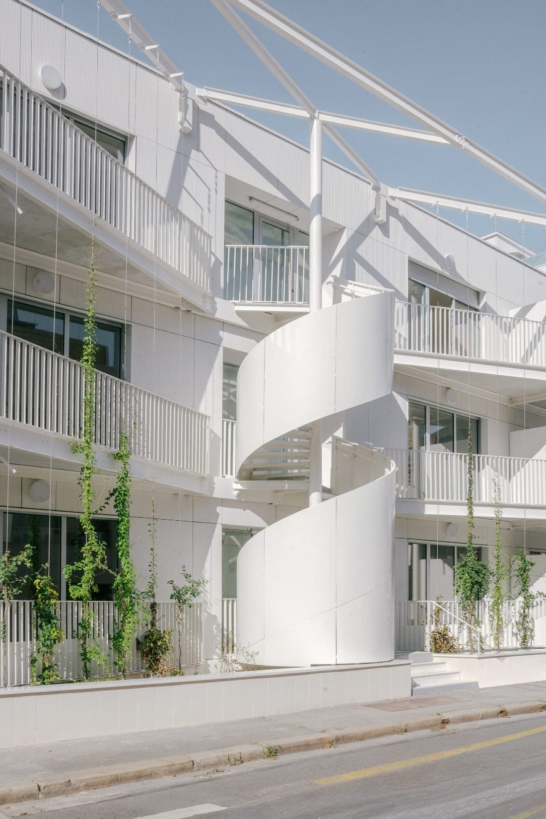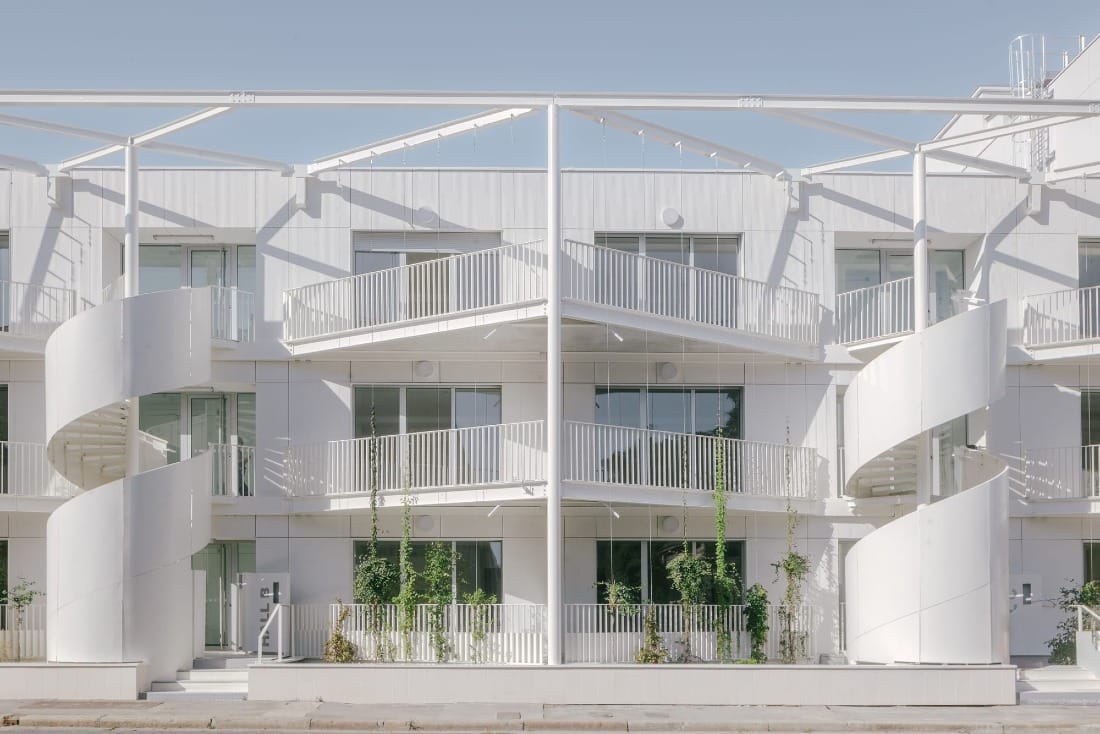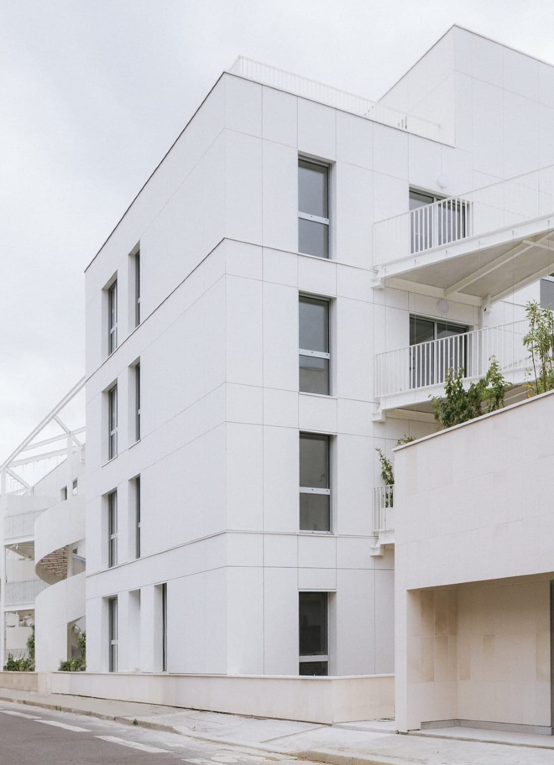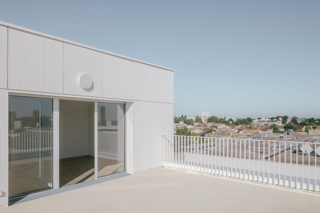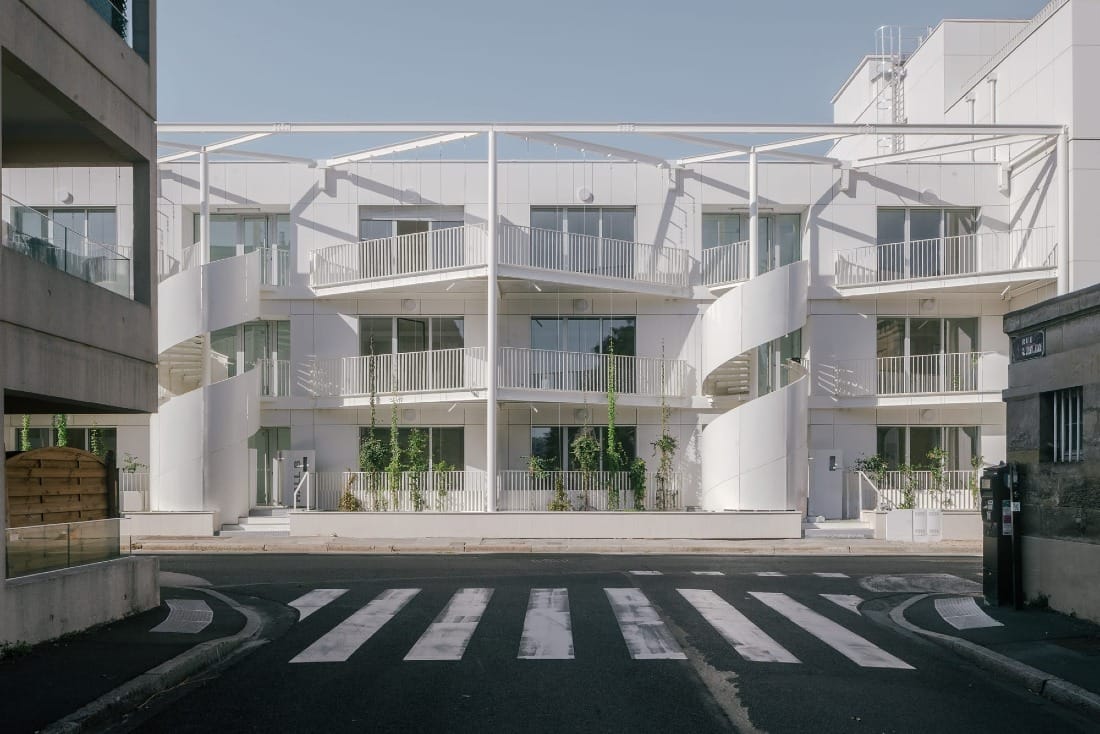 À Bordeaux, l’agence ZW/A Zweyacker & Associés signe la métamorphose de l’immeuble tertiaire du 56 Tivoli en une résidence de 25 logements. Le projet réinterprète l’existant avec clarté : un bâtiment des années 80 en L, à structure poteaux-poutres, libérant des plateaux facilement reconvertibles. L’ancienne façade opaque est remplacée par une enveloppe blanche ajourée, animée de balcons, de terrasses et d’escaliers extérieurs, générant des respirations visuelles et fonctionnelles.