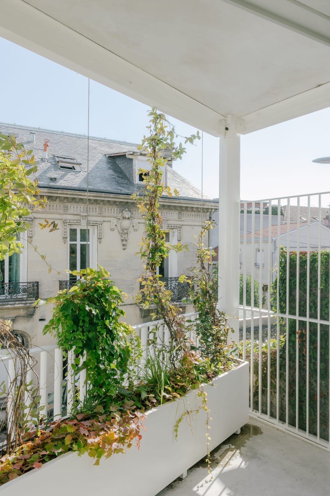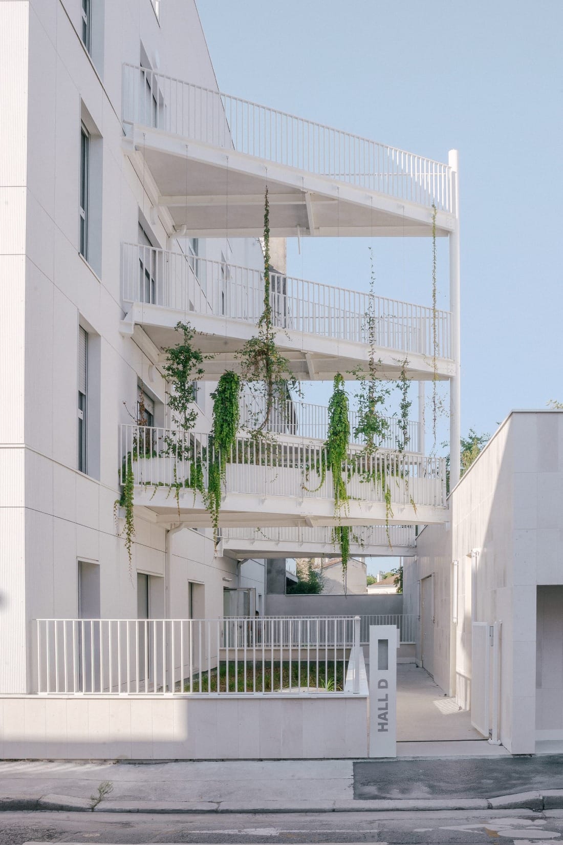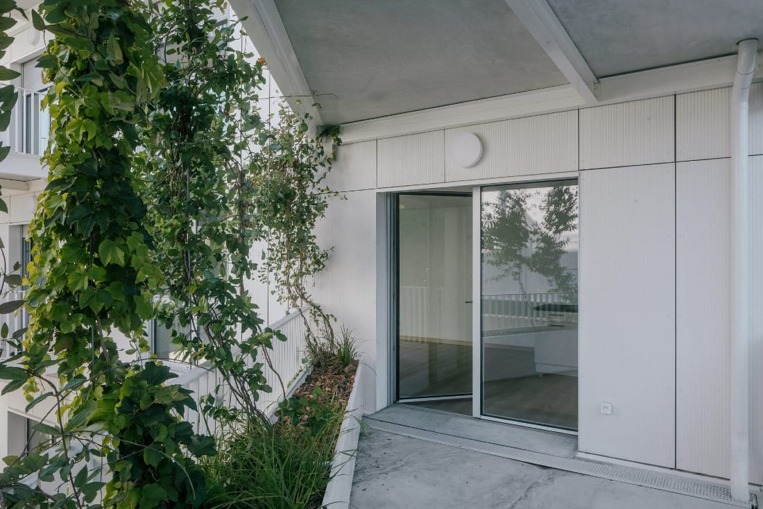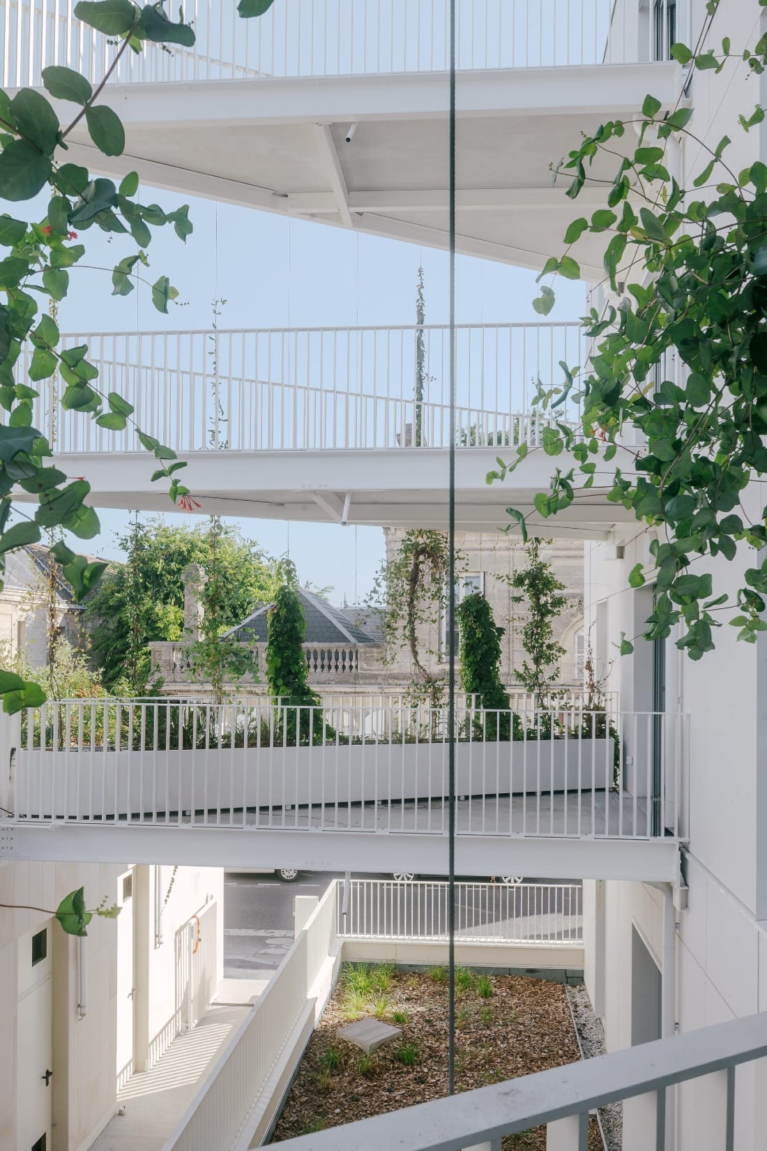 L’intervention se distingue par une approche constructive sobre et efficace. Les circulations sont déplacées en façade pour maximiser les surfaces habitables ; les logements, traversants, bénéficient de vues croisées et de généreux apports de lumière naturelle. La végétation accompagne les usages : jardinières en façade, rampes plantées, balcons végétalisés créent un filtre vivant entre espace privé et environnement urbain. Le projet exploite intelligemment les qualités initiales du bâti pour créer des ambiances domestiques différenciées.